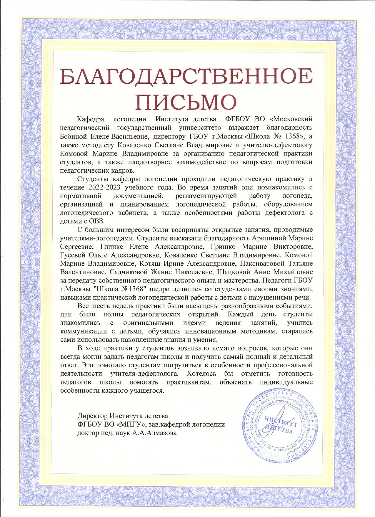 Кафедра логопедии Института детства ФГБОУ ВО «Московский педагогический государственный университет» выражает благодарность Бобиной Елене Васильевне, директору ГБОУ г.Москвы «Школа № 1368», а также методисту Коваленко Светлане Владимировне и учителю-дефектологу Комовой Марине Владимировне за организацию педагогической практики студентов, а также плодотворное взаимодействие по вопросам подготовки педагогических кадров.